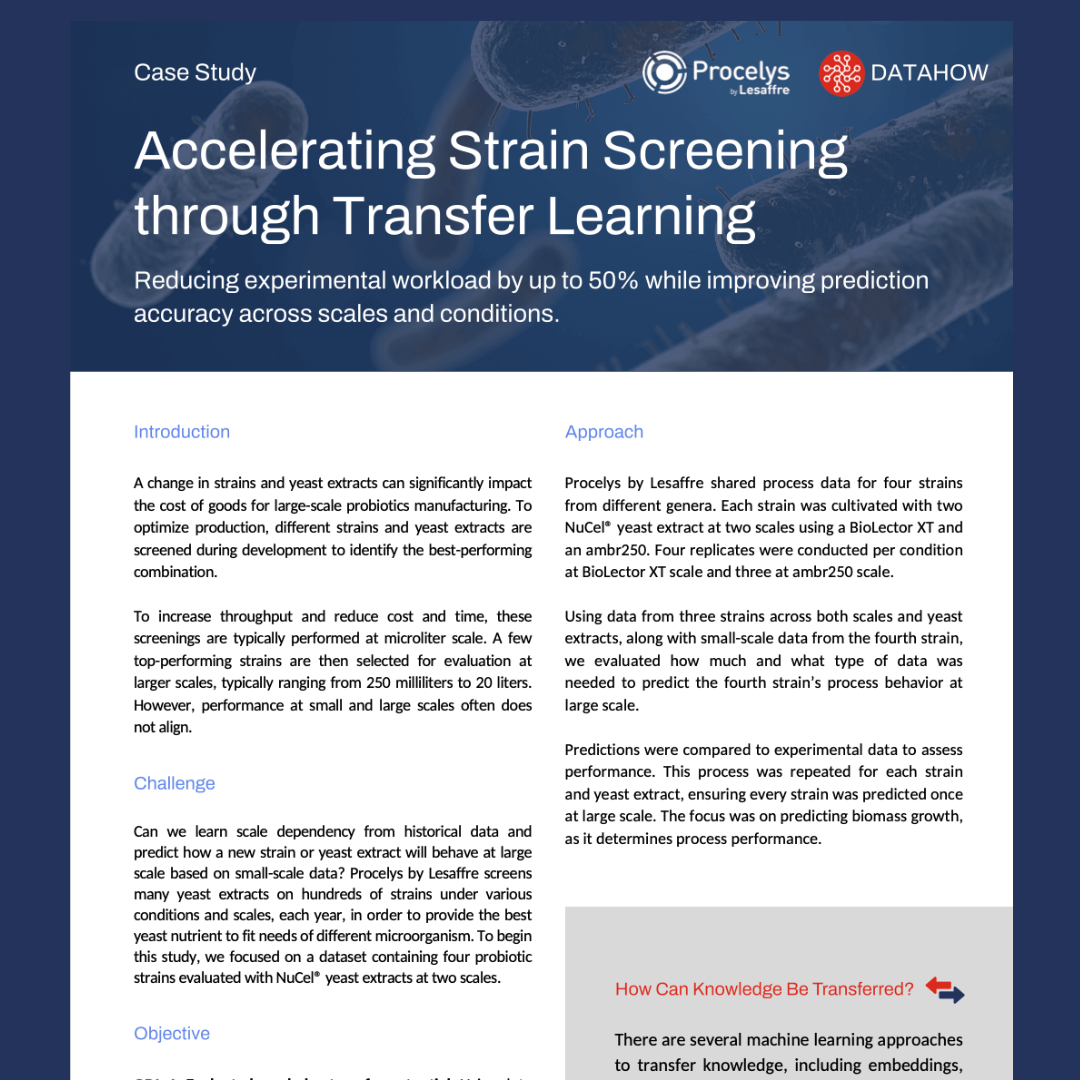 DataHow and Procelys by Lesaffre worked together and managed to reduce experimental workload by up to 50% while improving prediction accuracy across scales and conditions.