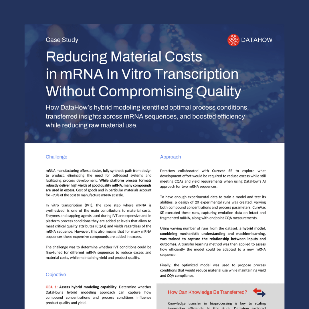 DataHow collaborated with CureVac using hybrid modeling to identify optimal process conditions, transferred insights across mRNA sequences, and boosting efficiency while reducing raw material use.